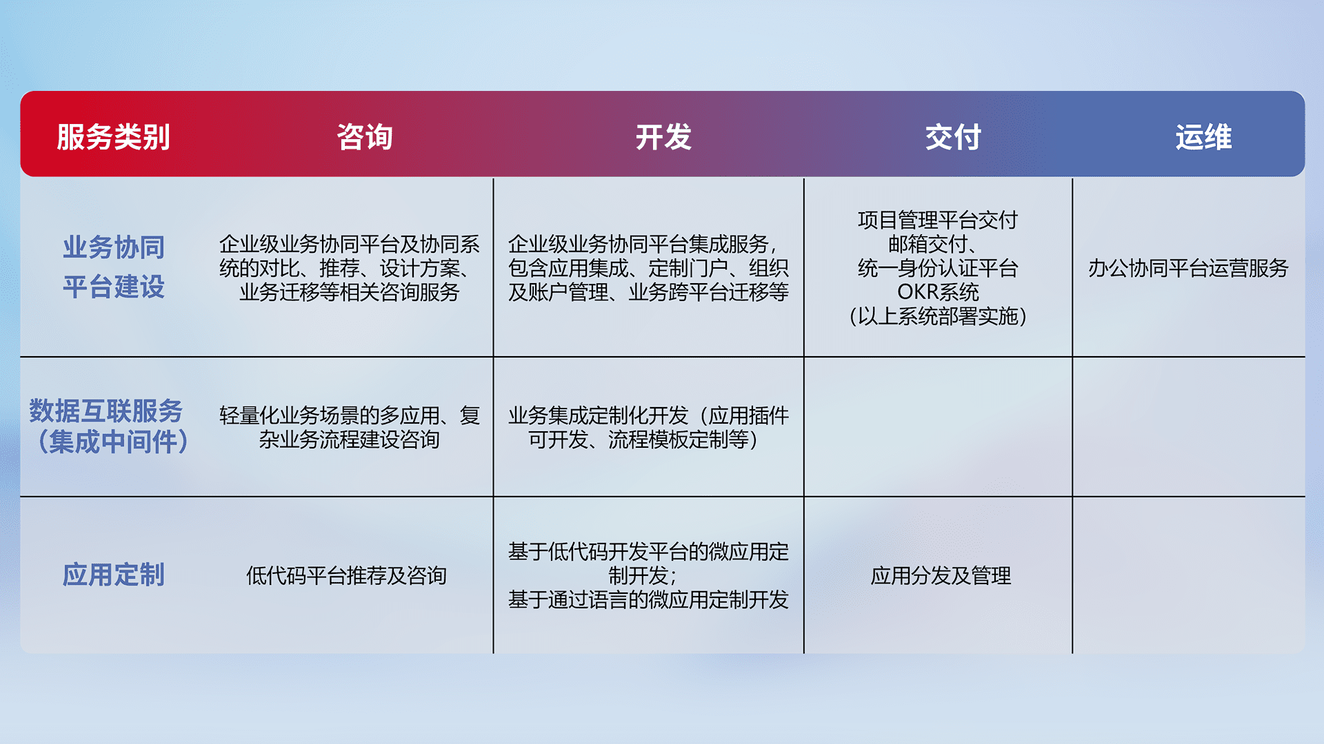 针对钉钉、、企微、、、、IDaas等平台级产品提供产品的规划、、、、方案、、交付、、、、定制化开发等服务,,实现如统一协同办公、、智能客户服务、、、混合会议管理、、智能数据查询、、、等业务场景,,实现数字化转型。。